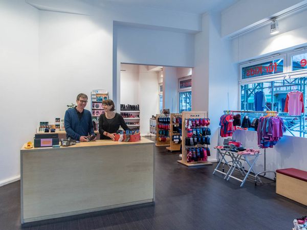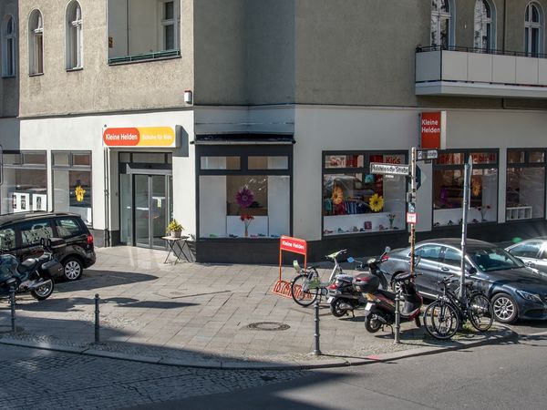 Avec son attrayante vitrine, la boutique à l’angle de Güntzelstraße et de Holsteinische Straße attire tout de suite l’œil. L’intérieur se caractérise par de grands espaces ouverts – pas de séparation, pas de rayonnage. Chez Kleine Helden – Schuhe für Kids, les étagères sur lesquelles sont présentées les marchandises sont toutes fixées aux murs. Les parents peuvent ainsi toujours garder un œil sur leurs enfants, et les enfants, sur leurs parents… Le magasin spacieux offre aussi suffisamment d’espace où laisser les poussettes.